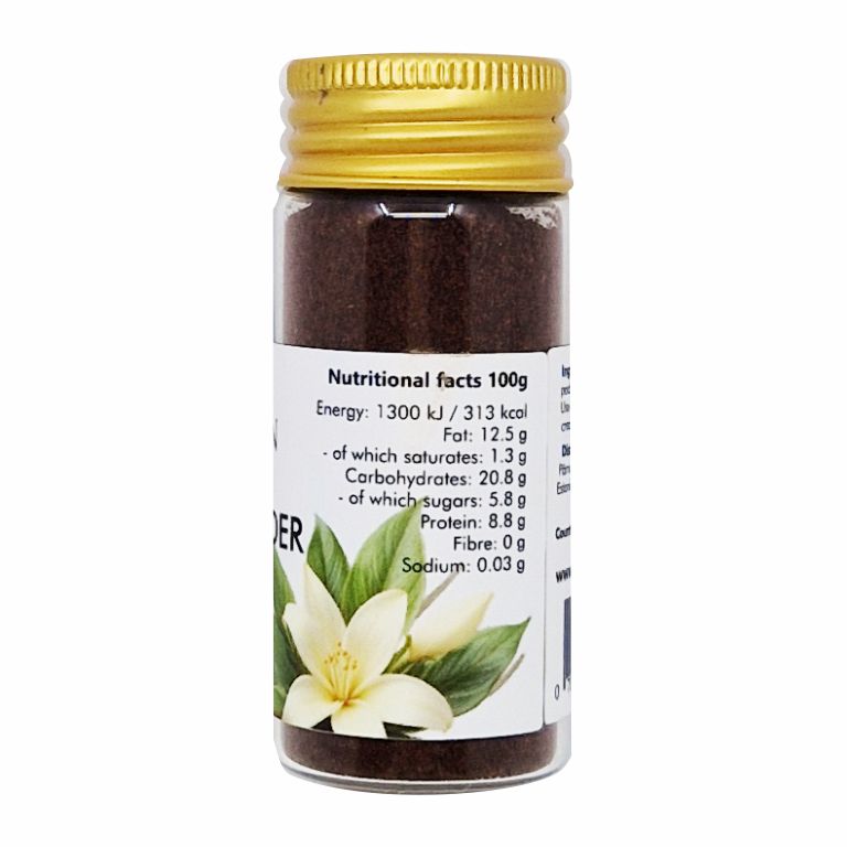 Bourbon vanilje pulber – Madagaskar on 100% looduslik jahvatatud vanilje, mille sügav, magus ja kergelt suitsune aroom muudab iga roa eriliseks. Valmistatud käsitsi korjatud Vanilla planifolia kaunadest, mis on kasvanud Madagaskari troopilises kliimas ja kuivatatud traditsioonilisel viisil. Sobib ideaalselt nii magusatesse kui soolastesse roogadesse, jookidesse ja küpsetistesse.