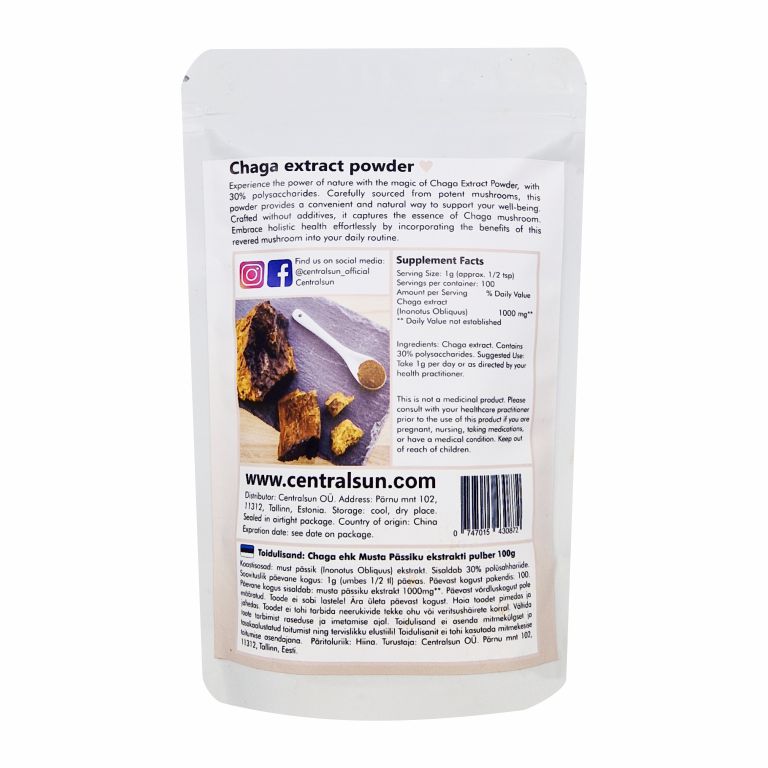 Centralsuns Chagaextraktpulver tillverkas av högkvalitativ björkticka, vars aktiva ämnen extraheras och koncentreras för att uppnå maximal naturlig styrka. Det är inte ett vanligt malet svamppulver, utan ett högkvalitativt extrakt som innehåller 30 % polysackarider – de bioaktiva föreningarna som ger Chaga dess välkända egenskaper.